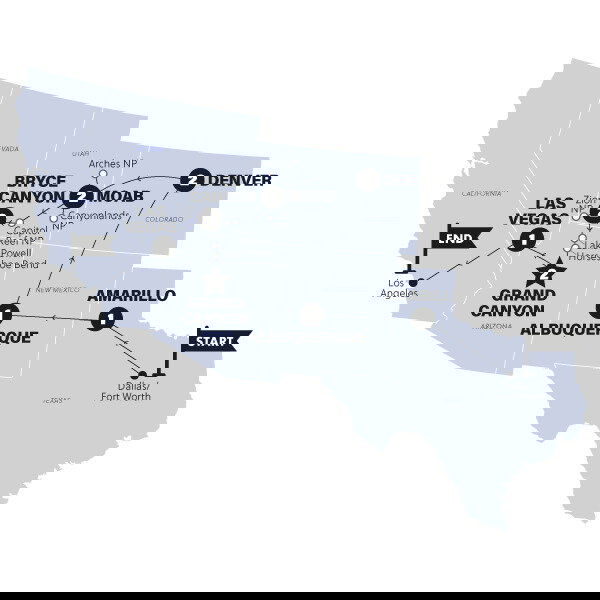 Gather round, roadies, gather round. The unforgettable US adventure starts today here in dreamy Dallas, and our first port of call is Amarillo. Let's go. Here we are. In true Americana Style, we'll visit Cadillac Ranch – a unique art exhibit celebrating the golden age of Cadillacs. Next, we'll beef up our evening with a Texan steakhouse dinner (and all the trimmings too.) But before we go any further, has anyone seen Sweet Marie? (D) Stay: Home 2 Suites (or similar)