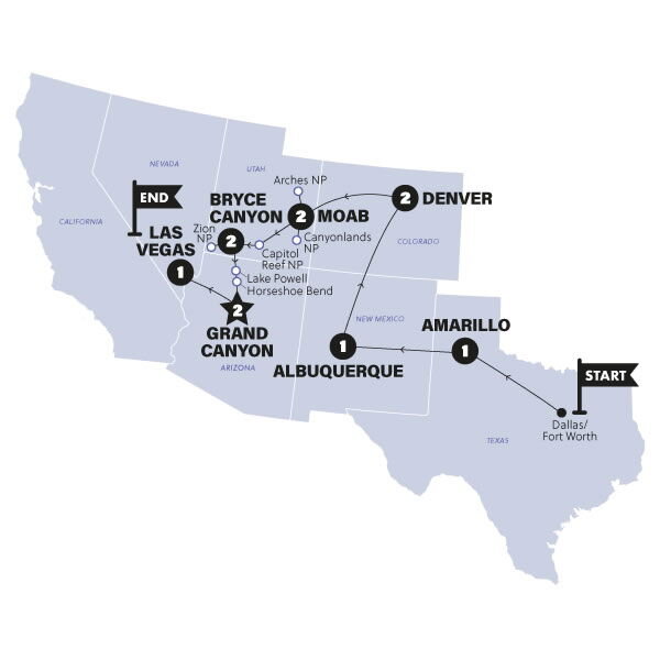 Gather round, roadies, gather round. The unforgettable US adventure starts today here in dreamy Dallas, and our first port of call is Amarillo. Let's go. Here we are. In true Americana Style, we'll visit Cadillac Ranch – a unique art exhibit celebrating the golden age of Cadillacs. Next, we'll beef up our evening with a Texan steakhouse dinner (and all the trimmings too.) But before we go any further, has anyone seen Sweet Marie? (D) Stay: Home 2 Suites (or similar)
