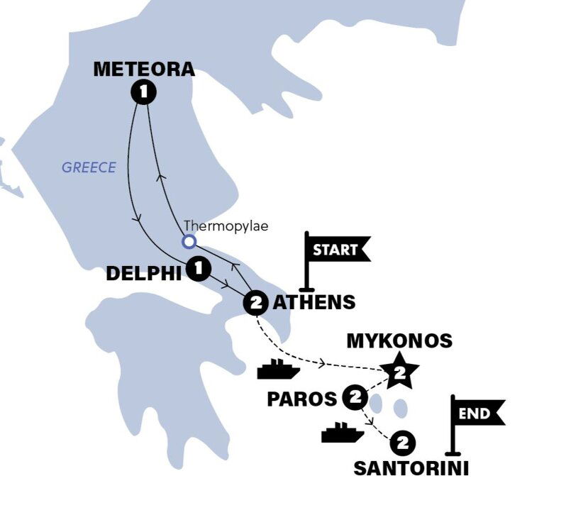 Not a second of today will go to waste. Europe's oldest city will unfold itself this morning as we take to the Parthenon and the Acropolis with the knowledge of a local. Then, it's off to the rocky cliffs of Meteora. Get ready to be blown away by history when we visit the Hot Gates of Thermophylae . You'll also see the Spartan memorial here to honour the people who sacrificed their lives during the epic battle between the Spartans & the Persians.