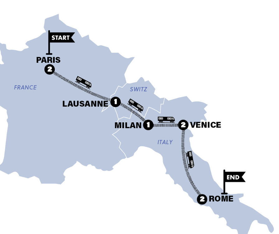 Rise and shine! First up, we'll have a free morning to explore before we hop on the train. Yes, we know. The train ride is super comfy. But trust us, you don't wanna sleep through this one. Today we'll ride along the scenic Simplon rail route to Italy - passing by jaw-dropping vistas of lakes, castles and tunnels on the way. Hello Milan! The only thing on the agenda this evening is chilling. And possibly sipping aperitivo in Navigli (just like the locals). That's how we roll. (B) Stay: B&B Hotel Milano Central Station (or similar)
