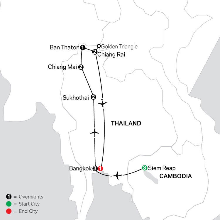 Fly to Bangkok and transfer to your hotel near the international airport. Prepare for departure tomorrow or journey into the city for independent exploration. (B)