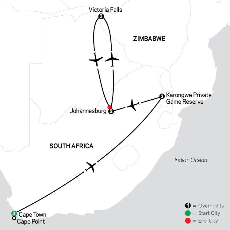 Your tour ends with a flight back to Johannesburg. Schedule departing flights after 7:30 pm. (B)
