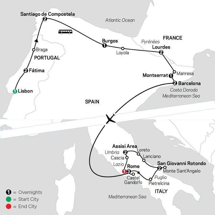 Stop in Braga to visit the Bom Jesus do Monte Sanctuary, where the cultural landscape evokes Christian Jerusalem, recreating a sacred mount crowned with a church. Continue into Spain and head for Santiago de Compostela. On arrival, an orientation walk introduces you to the old city center. Attend the [M] Pilgrim Mass. Today's Distance: 280 mi / 450 km (B/D)