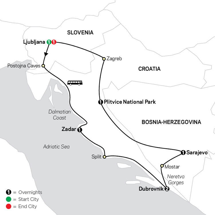 Undoubtedly, one of the highlights on this tour is a visit to the Postojna Caves. Take an included underground train ride and a walking tour, marvel at what are possibly Europe's most extensive and most beautiful caves. Then, cross into Croatia, traveling along the coast to Zadar. Over the centuries, Zadar was ruled by Venetians, Austro/Hungarians, by Italy after WWI, and today it belongs to Croatia. Learn more during the included guided tour. Today's Distance: 217 mi/ 350 km (B/D)