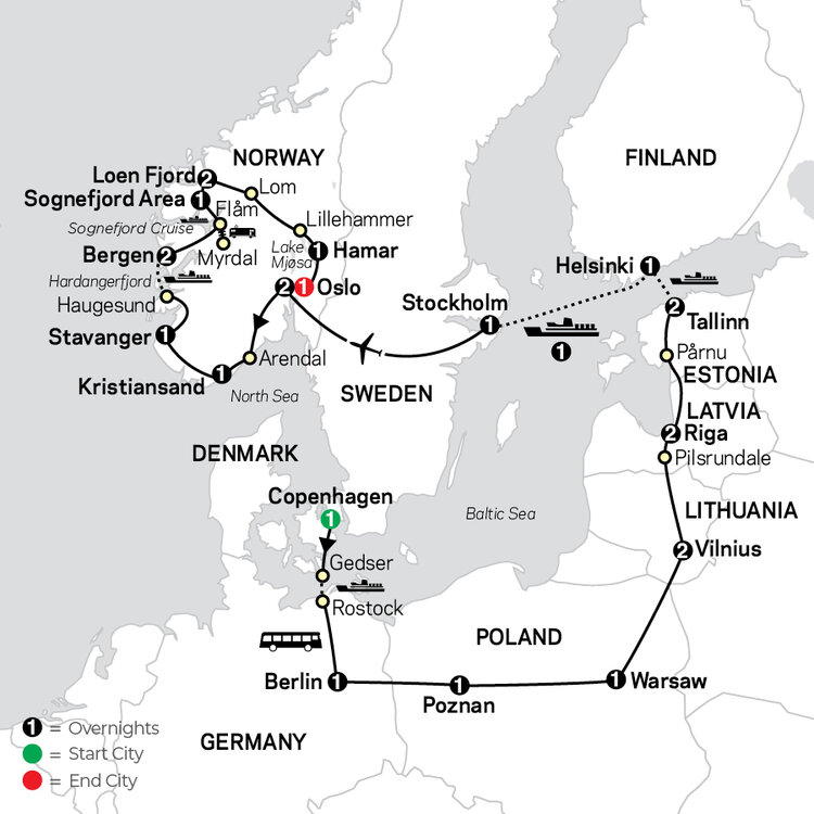 On the included sightseeing walk, discover the historic streets of the old town. Later, enjoy some leisure time or take the optional excursion to visit medieval Trakai Castle, with permission to pass over the wooden bridge to its storybook island setting on Lake Galve. (B)