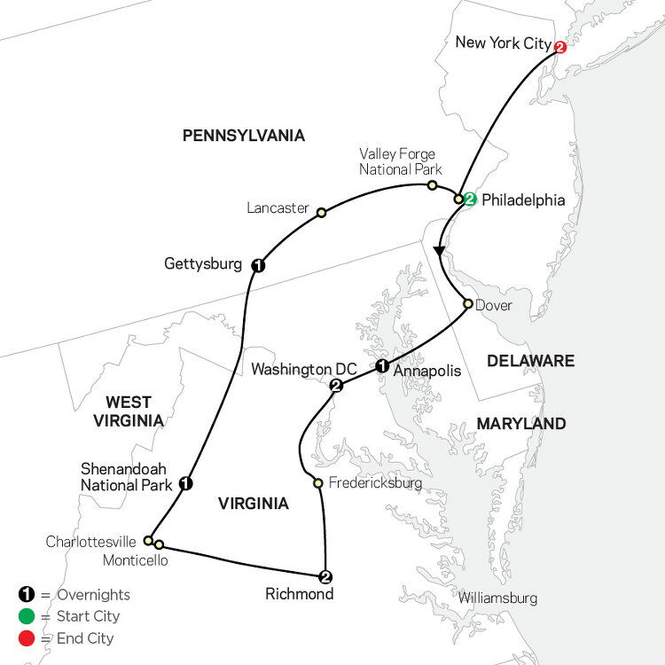 Head south to Delaware, the first of the 50 United States, for a stop at the Air Mobility Command Museum in Dover which showcases the history of military aviation. Then on to Annapolis, a picturesque city by the Chesapeake Bay. Visit the Maryland State House, one of the oldest state capitol buildings in the United States. Enjoy free time to stroll the cobblestone streets lined with shops, visit the US Naval Academy (Real ID required), and perhaps try some fresh local seafood, like their renowned Maryland blue crabs, while overlooking the harbor. (B)