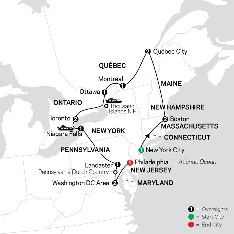 Journey through New Hampshire to the scenic White Mountains, crossing into Vermont and continuing to the Canadian border. Here you'll notice a change in language and tradition as you enter the French-Canadian province of Québec and historic Québec City on the banks of the St. Lawrence River. (B)