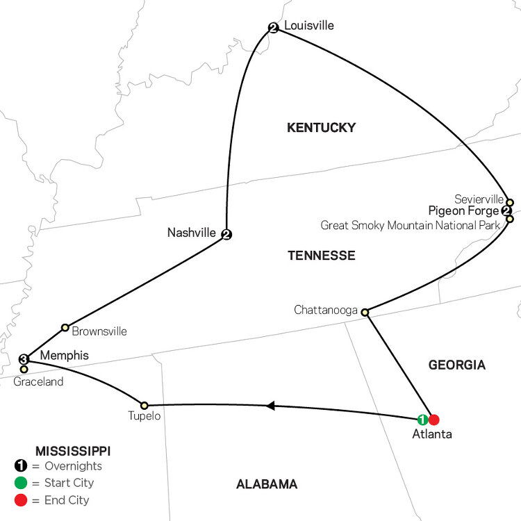 Take a short drive through beautiful Great Smoky Mountains National Park, the most visited national park in the U.S., then stop in Chattanooga, home of the Chattanooga Choo Choo. Continue on to Atlanta with a drop at Hartsfield-Jackson Atlanta International Airport where your vacation ends. Please schedule departing flights for after 6:00 p.m. Those with extra nights will continue to our Atlanta-area hotel.