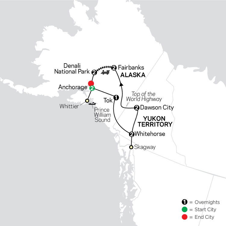 Relish one last look at the outstanding scenery and wildlife of Denali before traveling south toward Anchorage and the tour hotel for guests extending their stay in Alaska. For guests with homebound flights, the trip ends at Anchorage International Airport. With possible delays for weather, we strongly suggest that guests do not book flights prior to 5 pm.