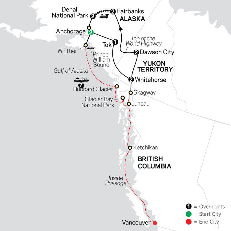 Relish one last look at the outstanding scenery and wildlife of Denali before traveling south toward Anchorage. After arrival in Anchorage, say goodbye to your Tour Director and transfer to Whittier and board your cruise ship. This remote village is nestled along breathtaking Prince William Sound, home to a stunning array of wildlife, including bald eagles, sea otters and killer whales, so have your camera ready. (D)