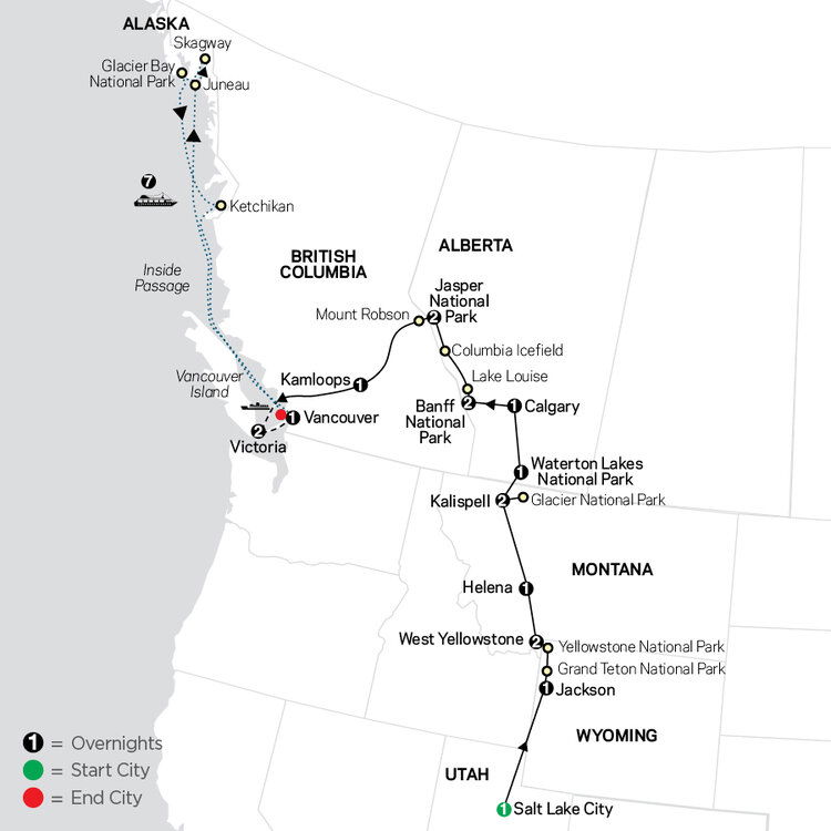 Cross into Canada and enter Waterton Lakes National Park where the wilderness of Alberta's prairies meets the natural beauty of the Canadian Rockies. You'll overnight in the park, which is brimming with diverse landscapes, crystal clear lakes, and towering mountain peaks. Enjoy a relaxing evening in this charming town with many nearby shops and restaurants. (B)