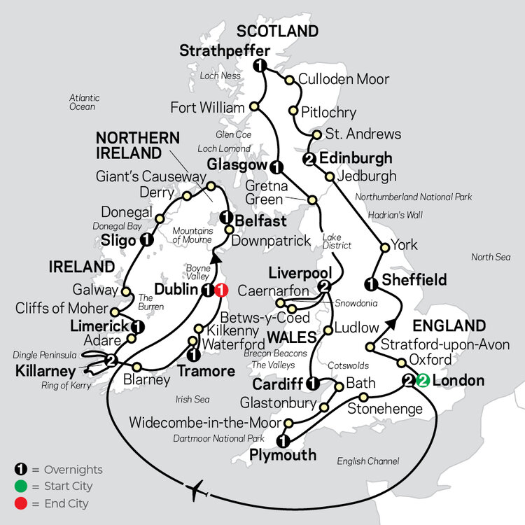 Travel from London to Dublin. At 3 pm, meet your Tour Director and travel companions for an afternoon orientation drive through statue-lined O'Connell Street and elegant Georgian squares to St. Patrick's Cathedral and Trinity College. Raise a glass this evening with an optional excursion to learn about the history, traditions, and brewing techniques behind one of the world's most popular beers on this fascinating tour, tasting and dinner at Dublin's legendary Guinness Storehouse. (B)