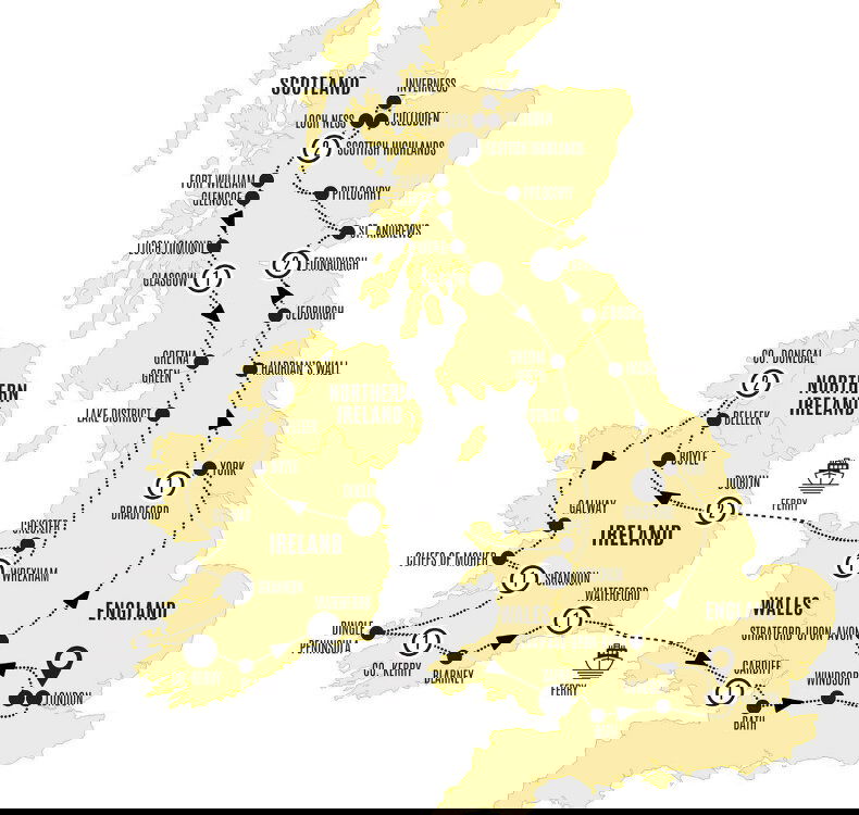 As your epic exploration of five countries comes to an end, there's time to fit in some last-minute sightseeing before returning to London. Cross the Severn Estuary into England and venture to Bath, with its elegant Georgian architecture and the Roman Baths which have given this ancient spa town its name. Visit Windsor and view the world's oldest and largest inhabited castle before shopping for Royal souvenirs. The King's home is a sight to behold before you continue to London where your journey comes to an end. (B)
