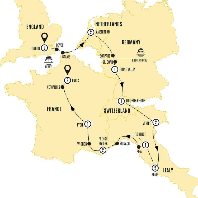 Kickstart your grand European journey with a full free day to explore all the surprises London has to offer. There's no shortage of things to do as you'll come to discover yourself - from the tranquillity of the Royal Parks to the shopping frenzy on Oxford Street, the pomp and pageantry of the city's royal landmarks to one of London's locals for a pint or two. (B)
