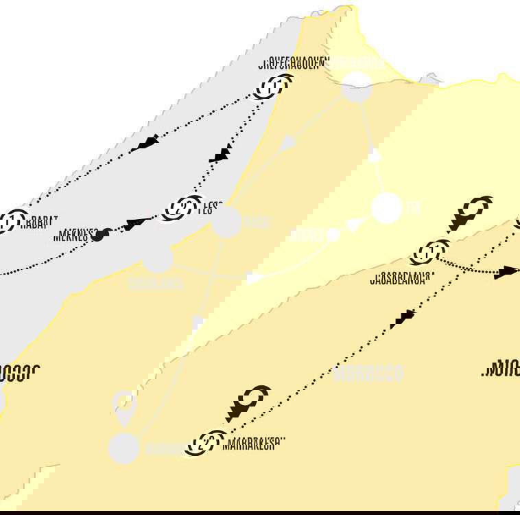 This afternoon, you'll arrive in Rabat and begin with an orientation tour of Morocco's capital. Start by viewing the Royal Palace, the King's official residence, displaying stunning traditional architecture. Then, marvel at the Hassan Tower, a 12th-century minaret and an iconic symbol of the city's rich history. Finally, visit the Mausoleum of Mohammed V, a beautifully decorated tomb that honours the late King and his sons. Your Local Guide will share insights into the history and significance of these remarkable landmarks. (B/D) Stay: Rihab