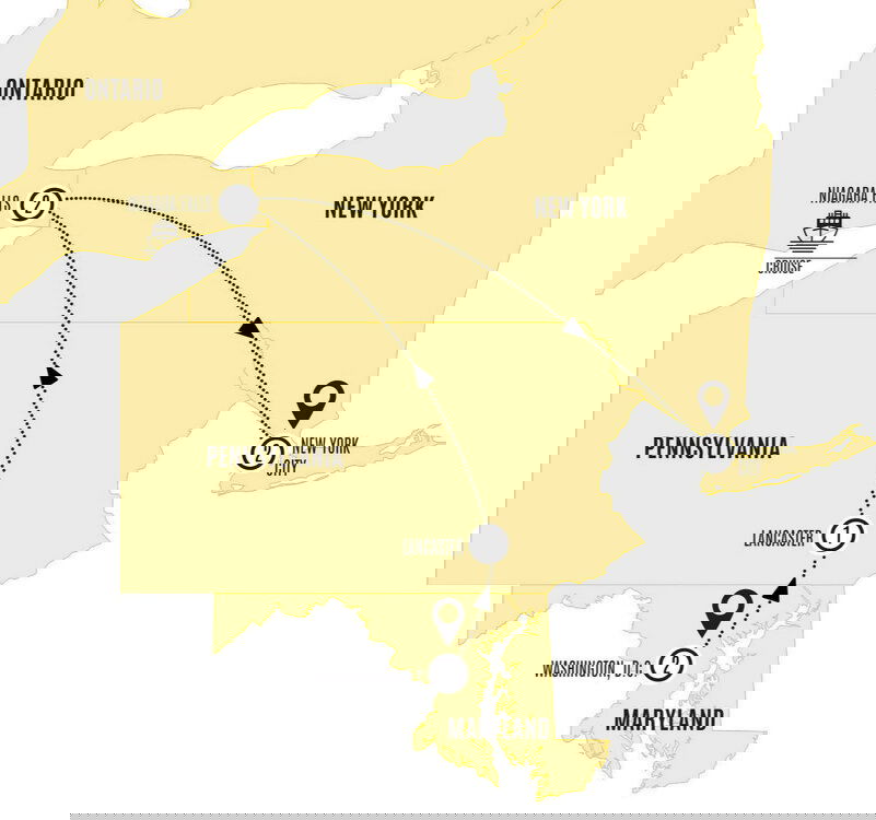 Bidding a fond farewell to Niagara Falls this morning, you'll journey back across the border through leafy and picturesque upstate New York. Passing by the fun-to-pronounce Poconos Mountains, which literally mean ‘creek between two hills', you'll venture towards the fast and fabulous metropolis of NYC.