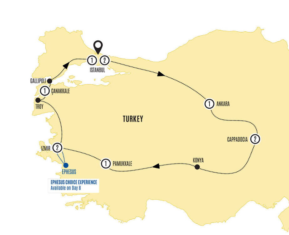 A poignant start to the day takes you to Gallipoli, where fierce World War I battles left a lasting legacy. Visit Anzac Cove, Lone Pine Cemetery and Chunuk Bair to honour the soldiers who gave their lives on both sides of the conflict. Then it's back to Istanbul for your final night. Fancy one last hurrah? Join a Choice Experience with dinner, drinks and a belly dancing show that brings the buzz of Istanbul to life. (B) Stay: Ibis Istanbul Zeytinburnu