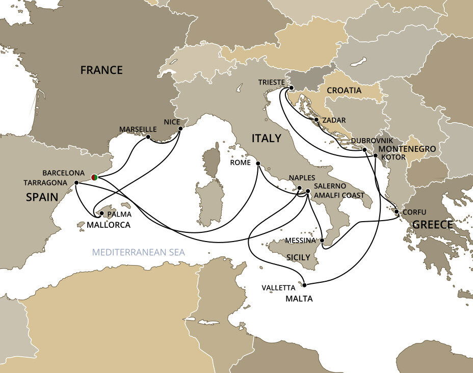 The lush and verdant island of Corfu lies in the Ionian Sea, midway between Greece and Italy. It is an island of sparkling beaches, mountains splashed with wildflowers, and historical, perched fortresses. Ships will dock at the town of Corfu.