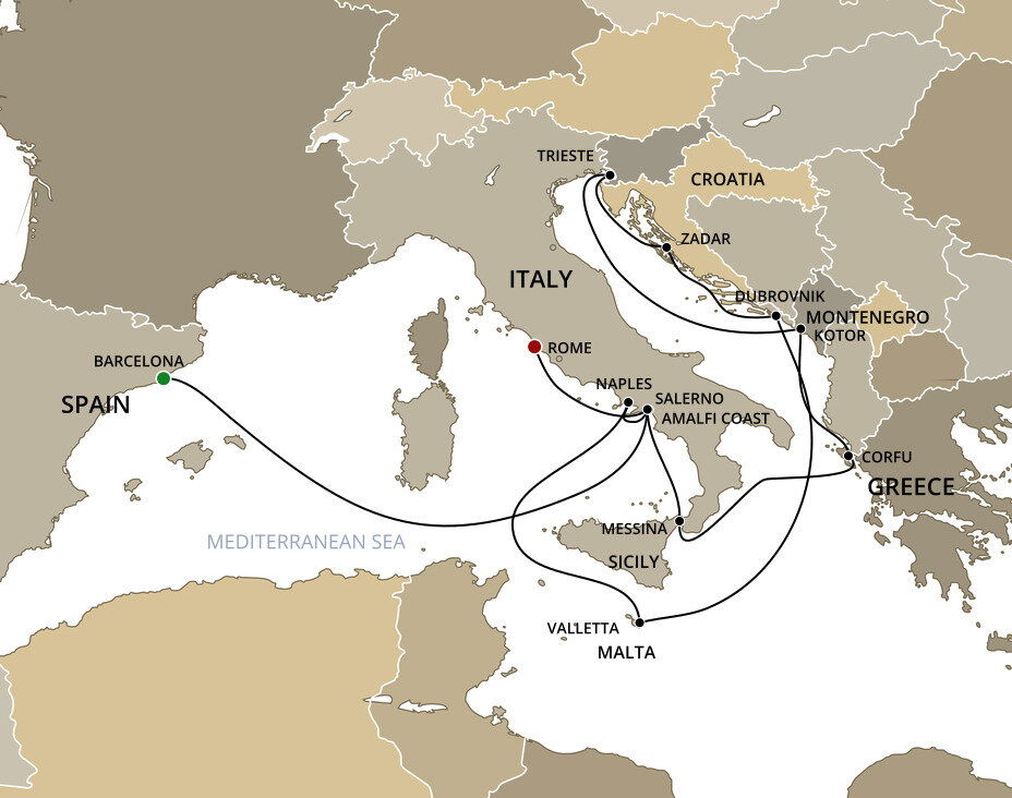 The lush and verdant island of Corfu lies in the Ionian Sea, midway between Greece and Italy. It is an island of sparkling beaches, mountains splashed with wildflowers, and historical, perched fortresses. Ships will dock at the town of Corfu.