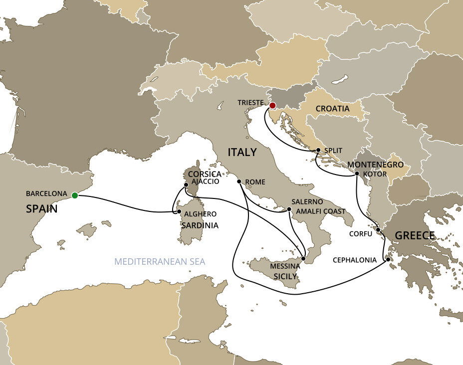 The lush and verdant island of Corfu lies in the Ionian Sea, midway between Greece and Italy. It is an island of sparkling beaches, mountains splashed with wildflowers, and historical, perched fortresses. Ships will dock at the town of Corfu.