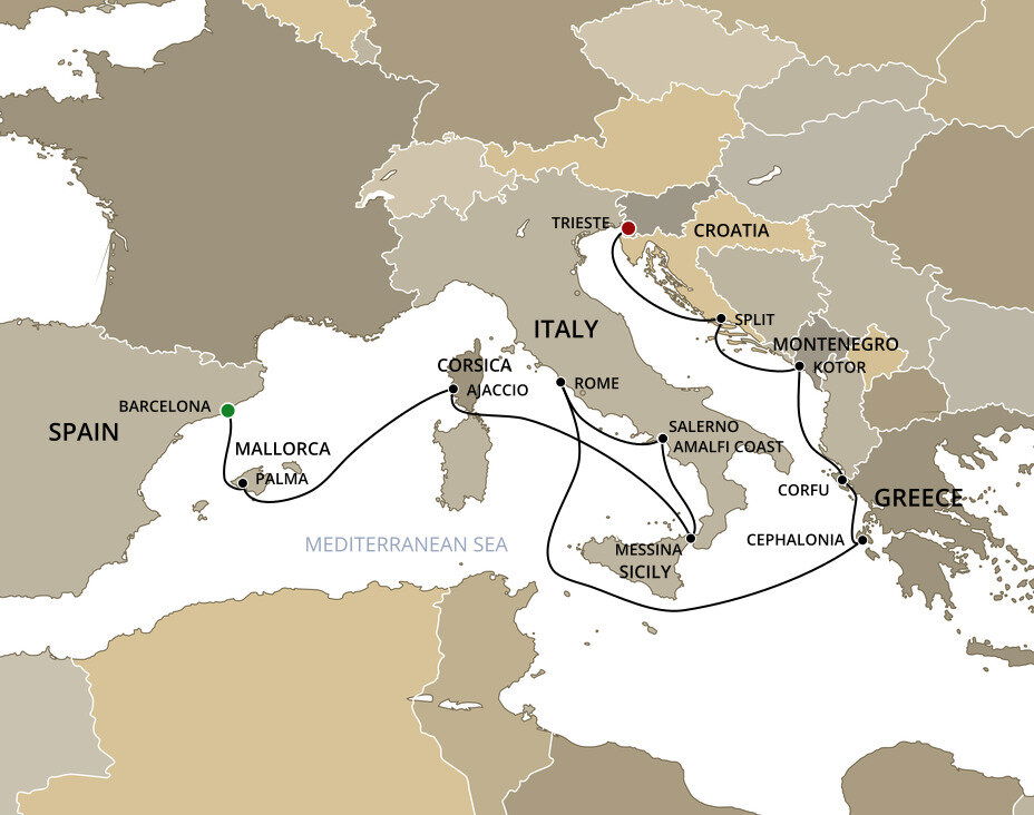 The lush and verdant island of Corfu lies in the Ionian Sea, midway between Greece and Italy. It is an island of sparkling beaches, mountains splashed with wildflowers, and historical, perched fortresses. Ships will dock at the town of Corfu.