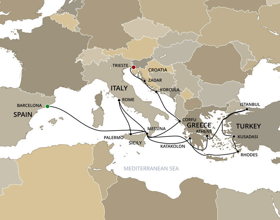 The lush and verdant island of Corfu lies in the Ionian Sea, midway between Greece and Italy. It is an island of sparkling beaches, mountains splashed with wildflowers, and historical, perched fortresses. Ships will dock at the town of Corfu.