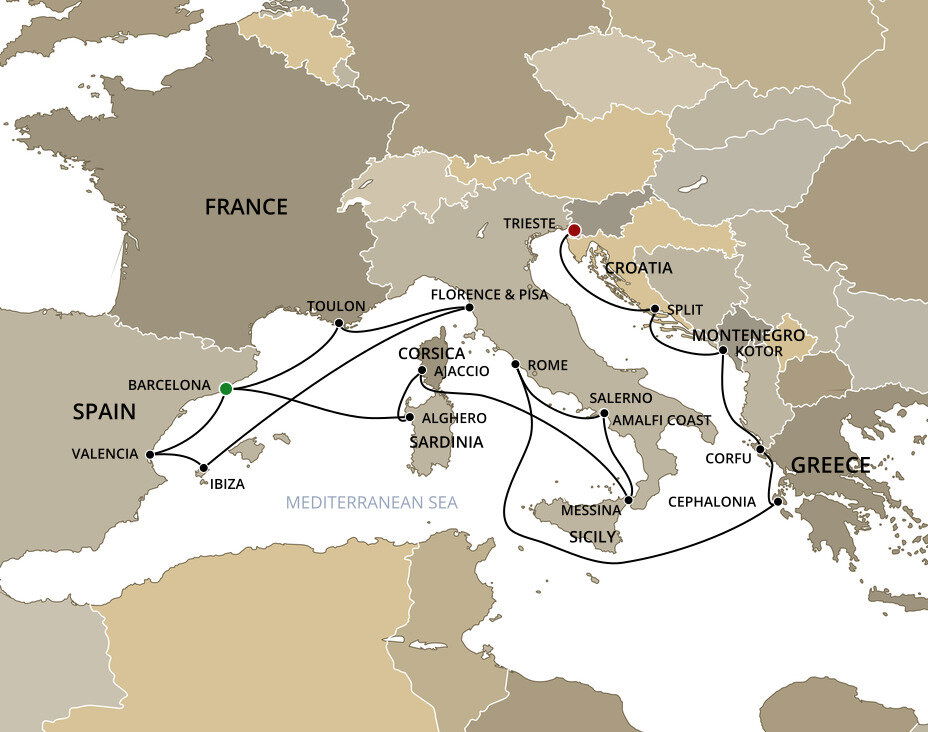 Encircled by dramatic ancient walls, which rise abruptly from deep-blue waters, Alghero's defences shelter one of Sardinia’s largest and most spectacular old towns. The uneven cobbled streets, rich history and Catalan flare alongside the nearby pristine beaches make Alghero a real highlight of Sardinia. Ships will anchor offshore and tender guests to shore.
