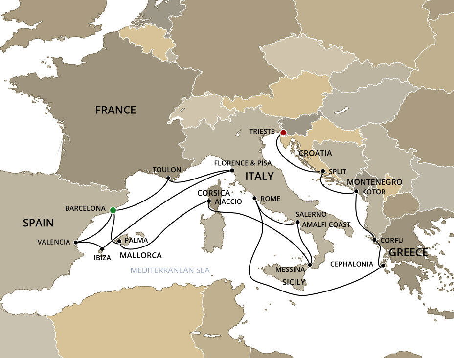 The lush and verdant island of Corfu lies in the Ionian Sea, midway between Greece and Italy. It is an island of sparkling beaches, mountains splashed with wildflowers, and historical, perched fortresses. Ships will dock at the town of Corfu.