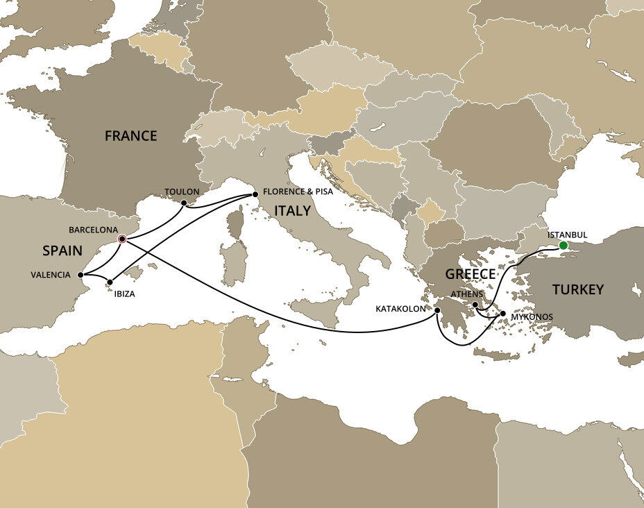 Your cruise finishes today in Barcelona, a captivating city on Spain's northeastern coast. If you're extending your stay in the city, start with a visit to La Sagrada Família, Antoni Gaudí's masterpiece, then wander through the narrow, historic streets of the Gothic Quarter.