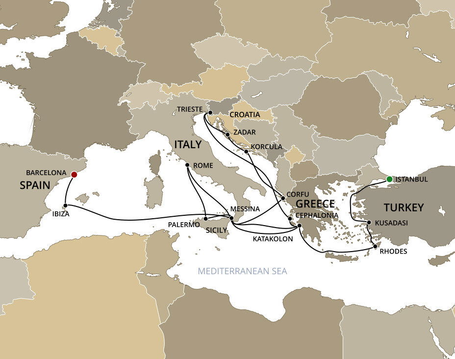 The lush and verdant island of Corfu lies in the Ionian Sea, midway between Greece and Italy. It is an island of sparkling beaches, mountains splashed with wildflowers, and historical, perched fortresses. Ships will dock at the town of Corfu.