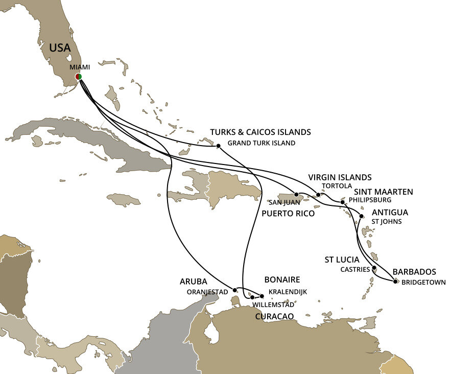 This multicultural city where the sun rules supreme is more than just a cruise port. Palm-lined causeways stretch across luminous Biscayne Bay as Miami rises in a gleam of glass towers, Art Deco curves, and tropical colour. Along Ocean Drive in South Beach, pastel facades from the 1930s glow beneath the Florida sun, while nearby Little Havana hums with domino parks, cigar shops, and the aroma of Cuban coffee. Beyond the shoreline, calm waters, yacht marinas, and breezy promenades frame a city shaped by Caribbean rhythms and sunlit coastal glamour.