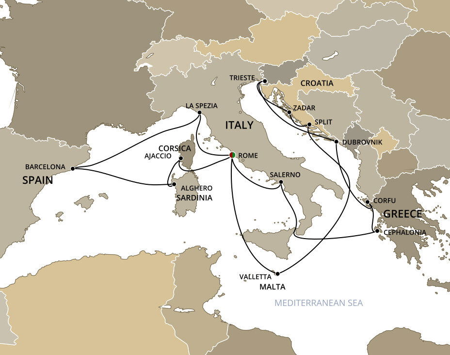 Encircled by dramatic ancient walls, which rise abruptly from deep-blue waters, Alghero's defences shelter one of Sardinia’s largest and most spectacular old towns. The uneven cobbled streets, rich history and Catalan flare alongside the nearby pristine beaches make Alghero a real highlight of Sardinia. Ships will anchor offshore and tender guests to shore.