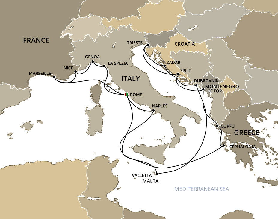 The lush and verdant island of Corfu lies in the Ionian Sea, midway between Greece and Italy. It is an island of sparkling beaches, mountains splashed with wildflowers, and historical, perched fortresses. Ships will dock at the town of Corfu.
