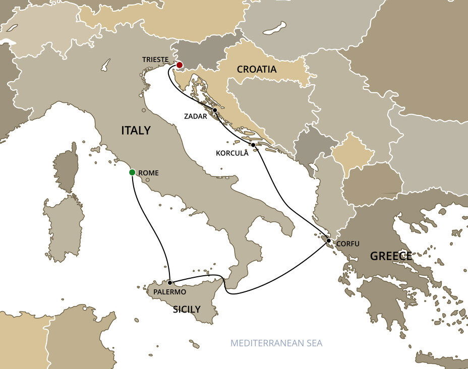 The lush and verdant island of Corfu lies in the Ionian Sea, midway between Greece and Italy. It is an island of sparkling beaches, mountains splashed with wildflowers, and historical, perched fortresses. Ships will dock at the town of Corfu.