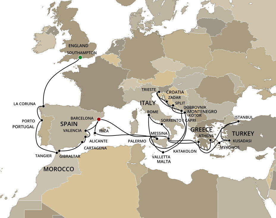 Your cruise finishes today in Barcelona, a captivating city on Spain's northeastern coast. If you're extending your stay in the city, start with a visit to La Sagrada Família, Antoni Gaudí's masterpiece, then wander through the narrow, historic streets of the Gothic Quarter.
