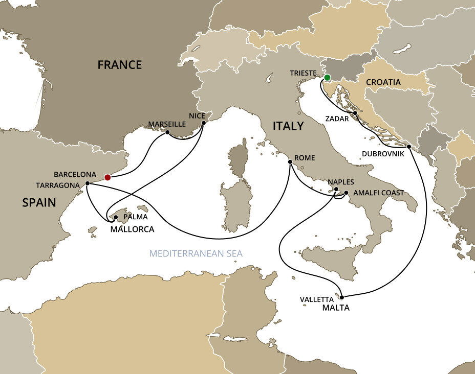 Your cruise finishes today in Barcelona, a captivating city on Spain's northeastern coast. If you're extending your stay in the city, start with a visit to La Sagrada Família, Antoni Gaudí's masterpiece, then wander through the narrow, historic streets of the Gothic Quarter.
