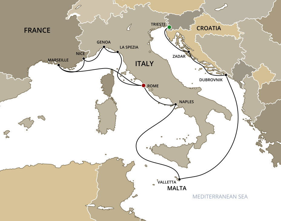 The entire city of Valletta, the capital of Malta, is a UNESCO World Heritage Site. Cited as one of the most concentrated historic areas in the world, it’s a cultural hub for Baroque art, museums, and historic sites. Ships will dock at the cruise port.