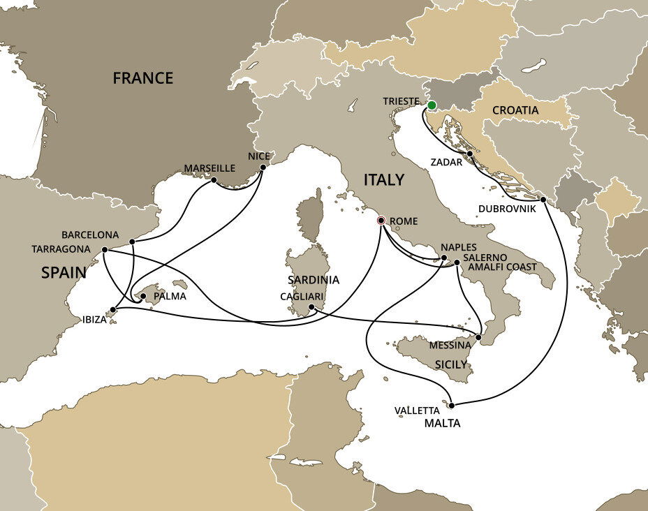 The lively seaport of Salerno is a thriving modern metropolis with ancient origins. Its elegant lungomare, a shoreside promenade, offers far-reaching views of the sea and the mountains beyond. The city boasts an ideal location with both the ruins of Roman cities and the stunning Amalfi Coast in easy reach. Ships will dock at this port.