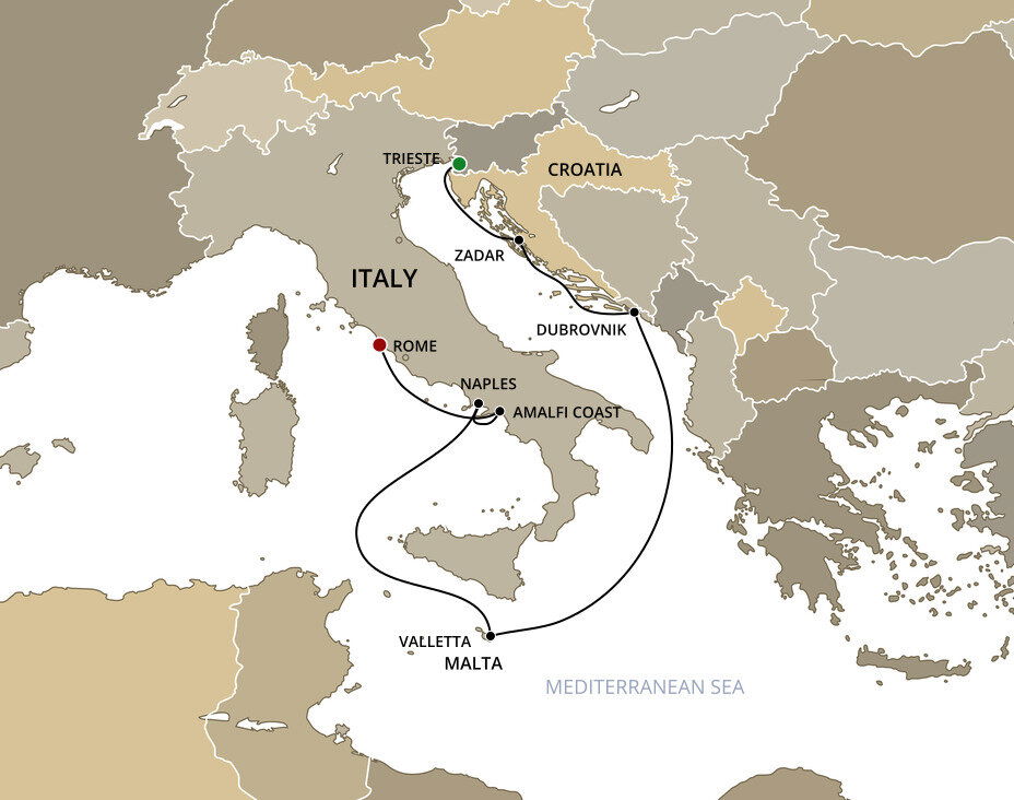 Venice is approximately 150 kilometers (93 miles) away, a journey that takes about 2 hours by train if you are making your own way to Trieste from Venice. Alternatively, your cruise documents will outline alternative transfer options.
