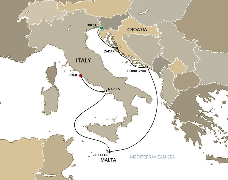 Your ship is docked at the Trieste Cruise Terminal, located right in the heart of the city. This makes it easy to explore Trieste before your departure and to visit key attractions like Piazza Unità d'Italia, the Roman Theatre, and Miramare Castle which are easily accessible by foot or a short bus ride.