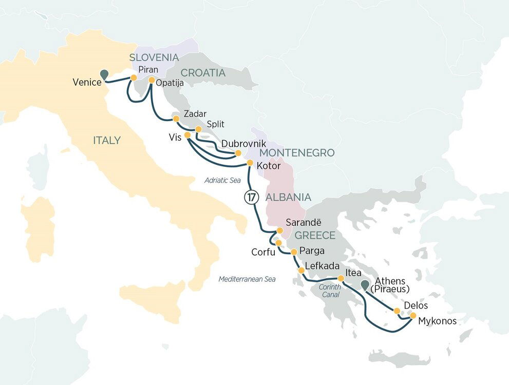 On mainland Greece, the resort town of Parga radiates a carefree holiday atmosphere. Enjoy the Mediterranean sunshine on one of the many lovely beaches, wander through traditional Greek villages and marvel at the 11th century Venetian Castle, which reveals an incredible bird’s eye view of this popular town and sparkling Ionian coastline. From Parga, you’ll journey to one of Greece’s largest and greenest islands, Corfu, alluring with sandy coves and rugged, verdant hills studded with olive, cypress, and citrus trees. (B/L/D)