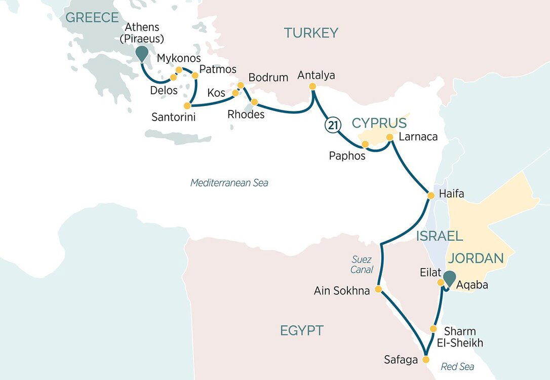 After breakfast, head out to explore this coastal city in Cyprus known for its beautiful beaches and ancient ruins. In the afternoon, we’ll welcome you back on board your Emerald Cruises luxury yacht for the second half of your journey towards Israel, Egypt and Aqaba. (B/L/D)