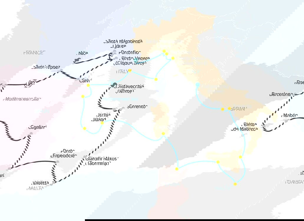 Your luxurious yacht cruise returns to Italian shores today and concludes in Civitavecchia, the main seaport for the dynamic capital of Italy, Rome. Here you'll be transferred to the airport for your return flight home or to continue your travels.