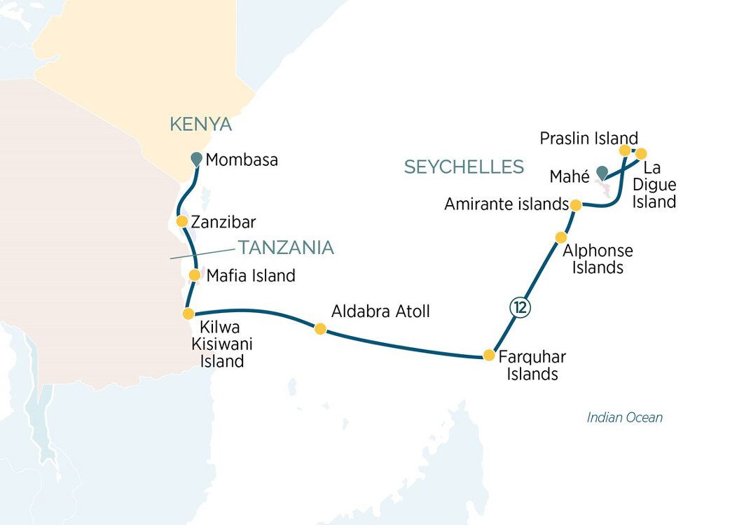 The itinerary is a guide only and may be amended for operational reasons. As such Emerald Cruises cannot guarantee the cruise will operated unaltered from the itinerary states above. Please refer to our terms and conditions for further information. (B)Your cruise begins in Mombasa, a coastal city in southern Kenya that was the first capital of British East Africa. It’s a melting pot of cultures from all corners of Africa and the Indian Ocean. Here you’ll be transferred to your Emerald Cruises luxury yacht and embark on your discovery of the Indian Ocean and Seychelles. (D)