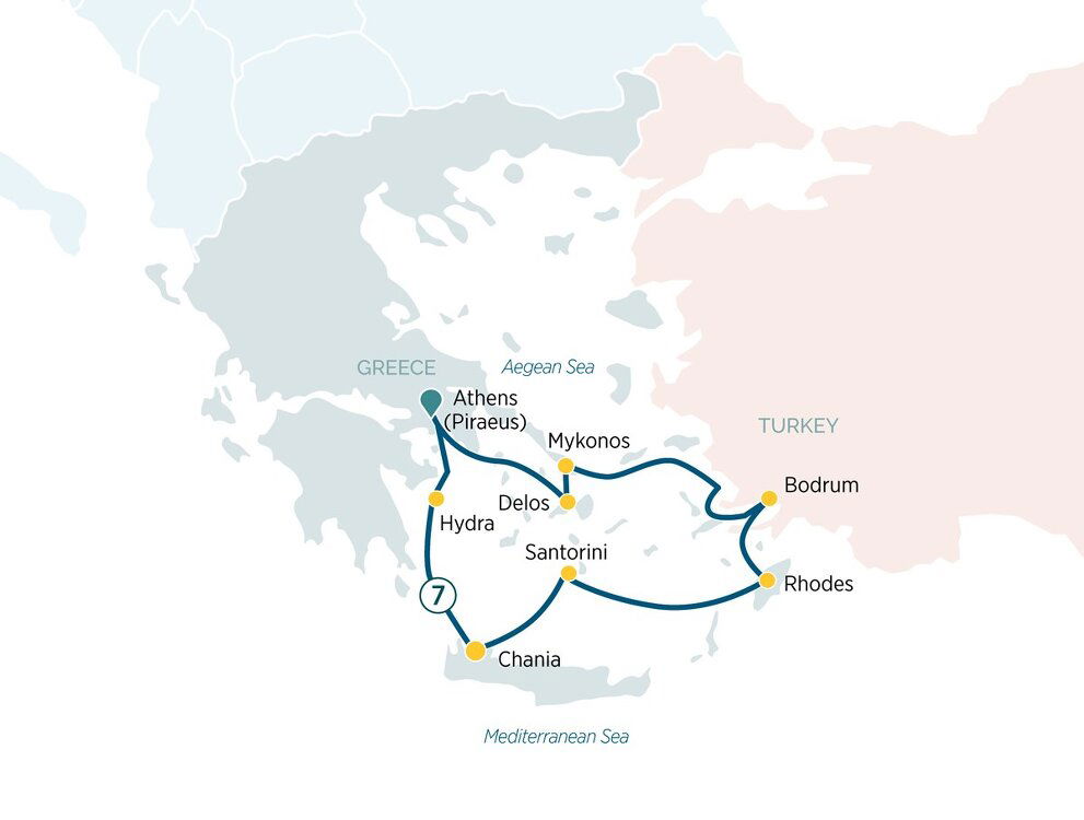 A small rocky island at the heart of the stunning Cyclades archipelago, Delos is one of the most important mythological and archaeological sites in Greece and a UNESCO World Heritage-listed Site believed to be the birthplace of the Greek God Apollo and his twin sister, Artemis. In the afternoon, you’ll cruise on to another beautiful Greek Island, Mykonos, a world-famous island whose allure lies in its blend of traditional Greek culture and cosmopolitan flair. Whitewashed houses adorned with vibrant blue doors edging the narrow, cobblestone streets of atmospheric Mykonos Town further add to the charm; so too, the island’s historic windmills and pretty beaches. (B/L/D)