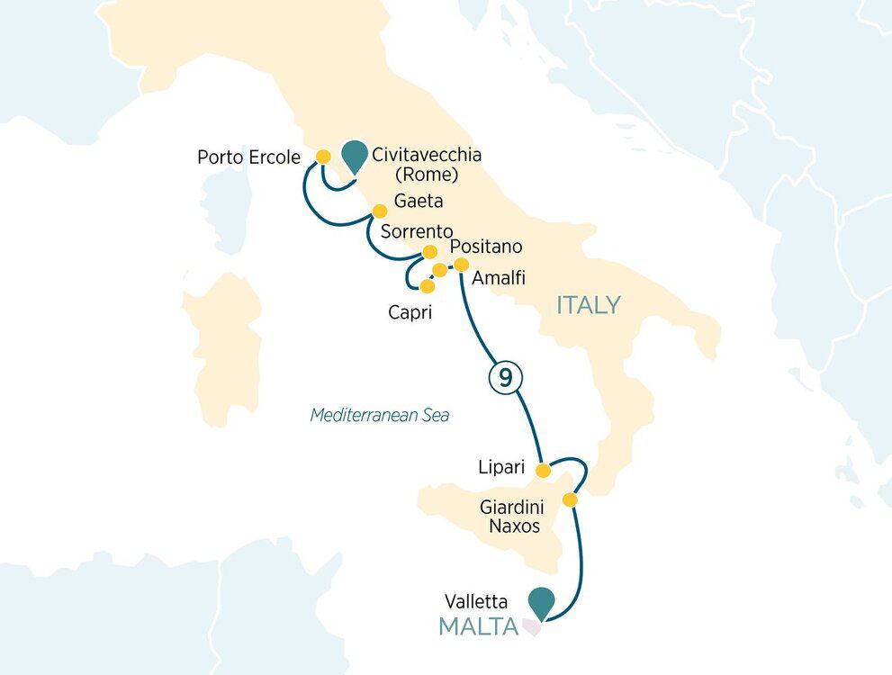 The largest and most populated of the Aeolian Islands, Lipari presents a volcanic archipelago set off the coast of Sicily and embedded within the shimmering Tyrrhenian Sea. The gorgeous island scenery comes defined by a rugged coastline, beautiful beaches lapped by crystal line turquoise waters and lush vegetation. Lipari also boasts a charming Old Town, delightful with its quaint streets and traditional houses painted in pastel hues, as well as a 16th- century castle, which reveals panoramic views of the surrounding area. (B/L/D)