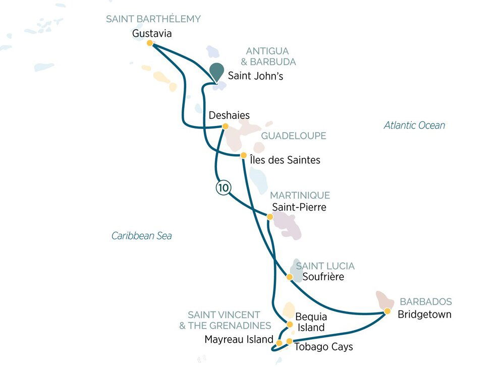 Your enchanting Caribbean voyage begins in St. John's, capital of the island-nation of Antigua and Barbuda. From here, you'll be transferred to your Emerald Cruises luxury yacht and embark on your marvellous discovery of the Eastern Caribbean and the Grenadines. (D)