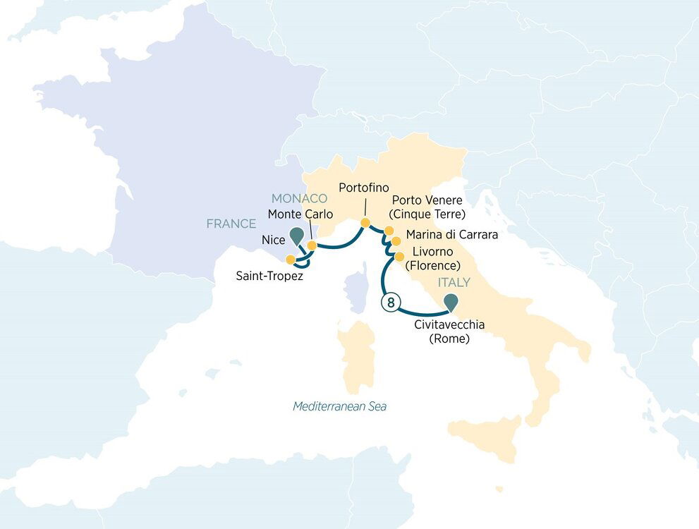 Your luxurious yacht cruise returns to Italian shores and concludes in Civitavecchia, the main seaport and gateway for the dynamic capital of Italy, Rome – known as the ‘Eternal City' and enthralling with its magnificent ancient landmarks. From the yacht, you'll be transferred to the airport for your return flight home, or to continue your holiday.