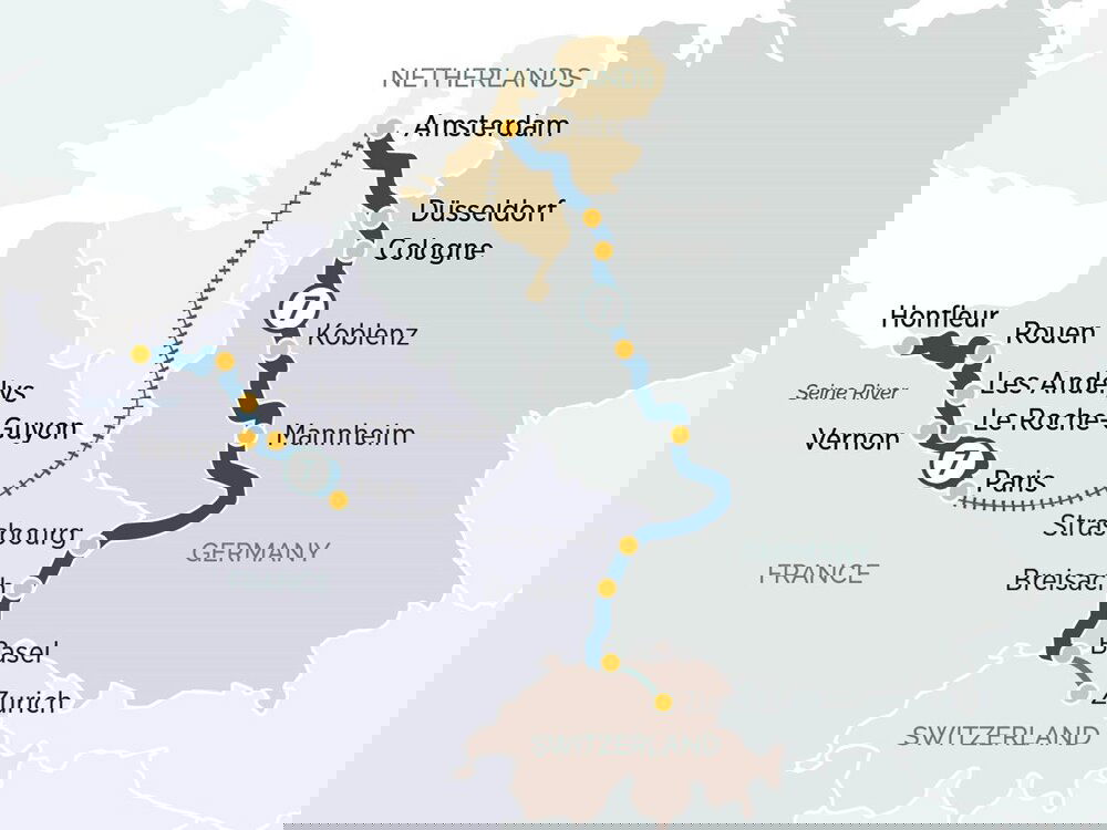 Join a walking tour of Düsseldorf, a vibrant city renowned for its stylish boutiques and charming Old Town. Stroll along the picturesque Rhine River, admire the stunning architecture, and discover hidden gems off the beaten path. Later this day we will arrive in Cologne, famous for its Gothic Cathedral. This afternoon you can immerse yourself in the city's lively atmosphere, indulge in delicious local cuisine, and experience the unique charm of the city. (B/L/D)