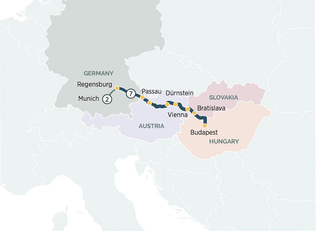 Explore the medieval centre of Regensburg with your insightful local guide. Stroll along the cobblestone streets, passing the patrician houses of the UNESCO World Heritage-listed Old Town, and stop by to sample traditional Bavarian sausages, a delicious local specialty. Alternatively, join a guided bike tour to the Walhalla monument, which towers high above the banks of the Danube. From here, you can admire a panoramic view of the river and surrounding scenic landscape. (B/L/D)
